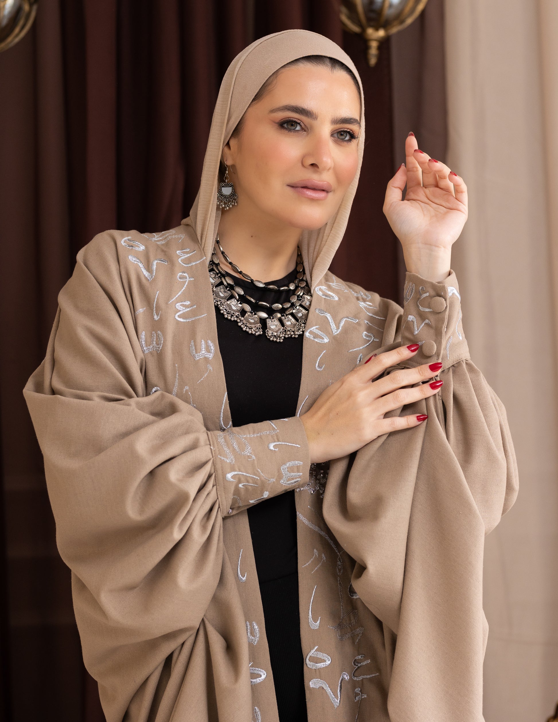 A flowy cream kaftan with a distinctive silhouette, detailed with stylish accents. Silver calligraphy embroidery graces the wrists and center, celebrating creativity in every stitch.