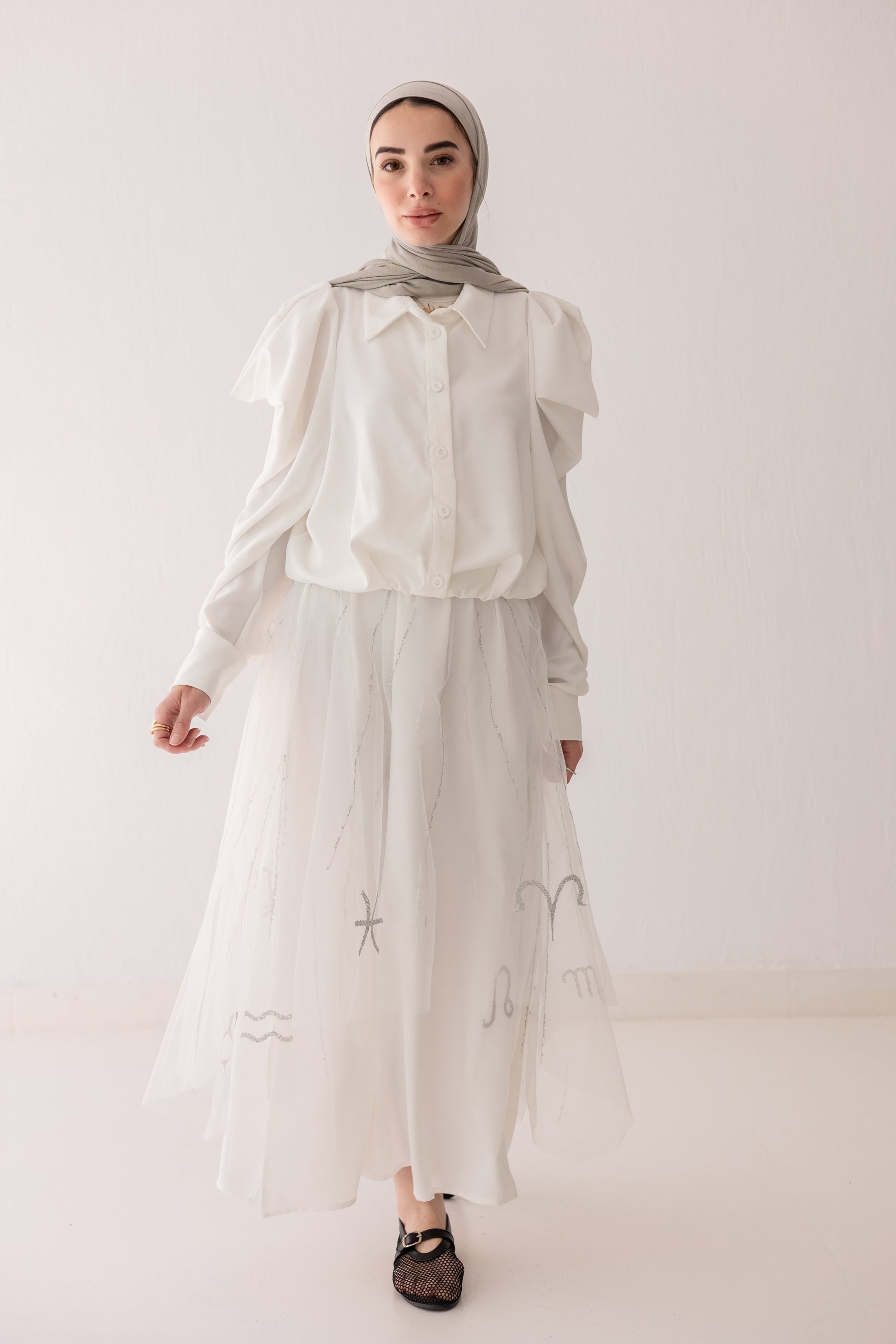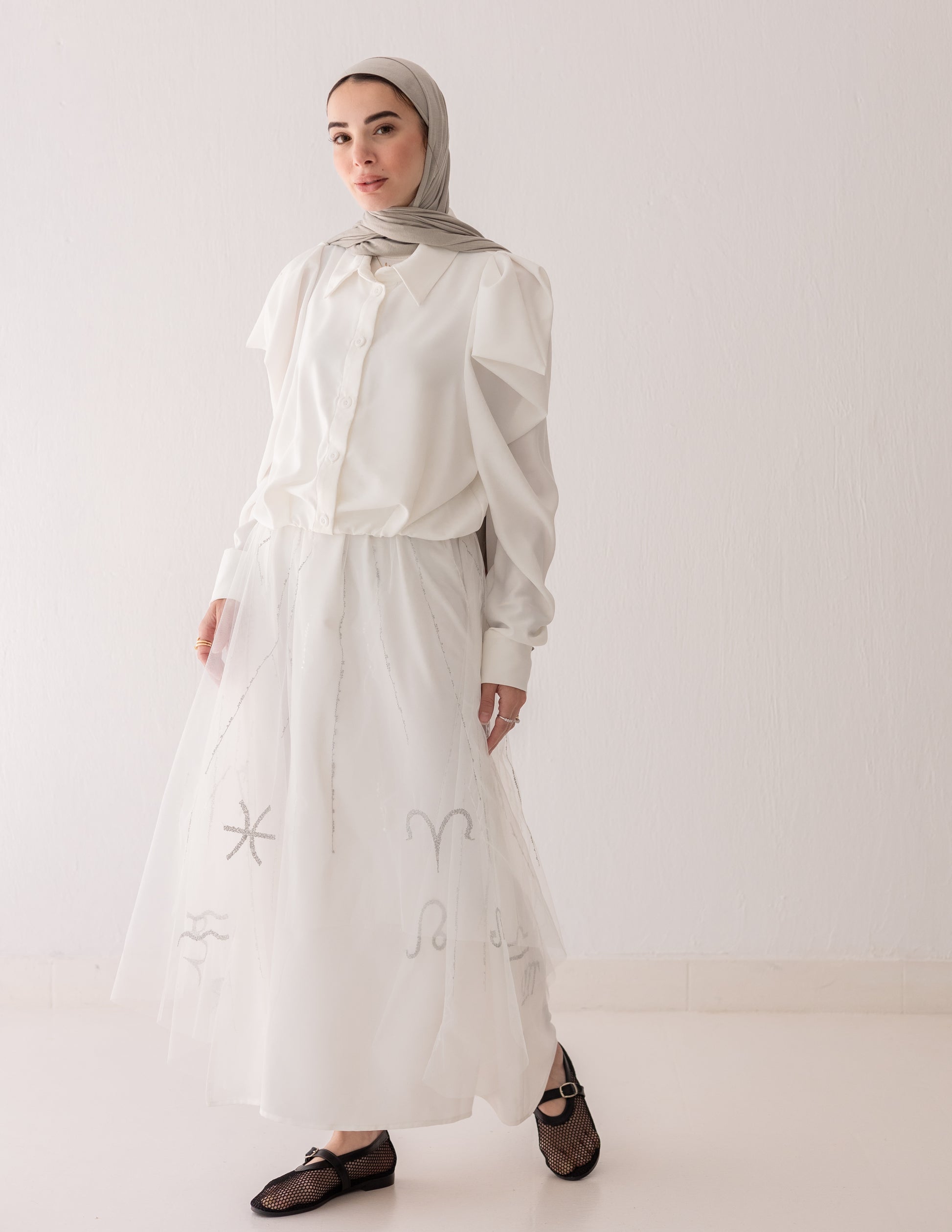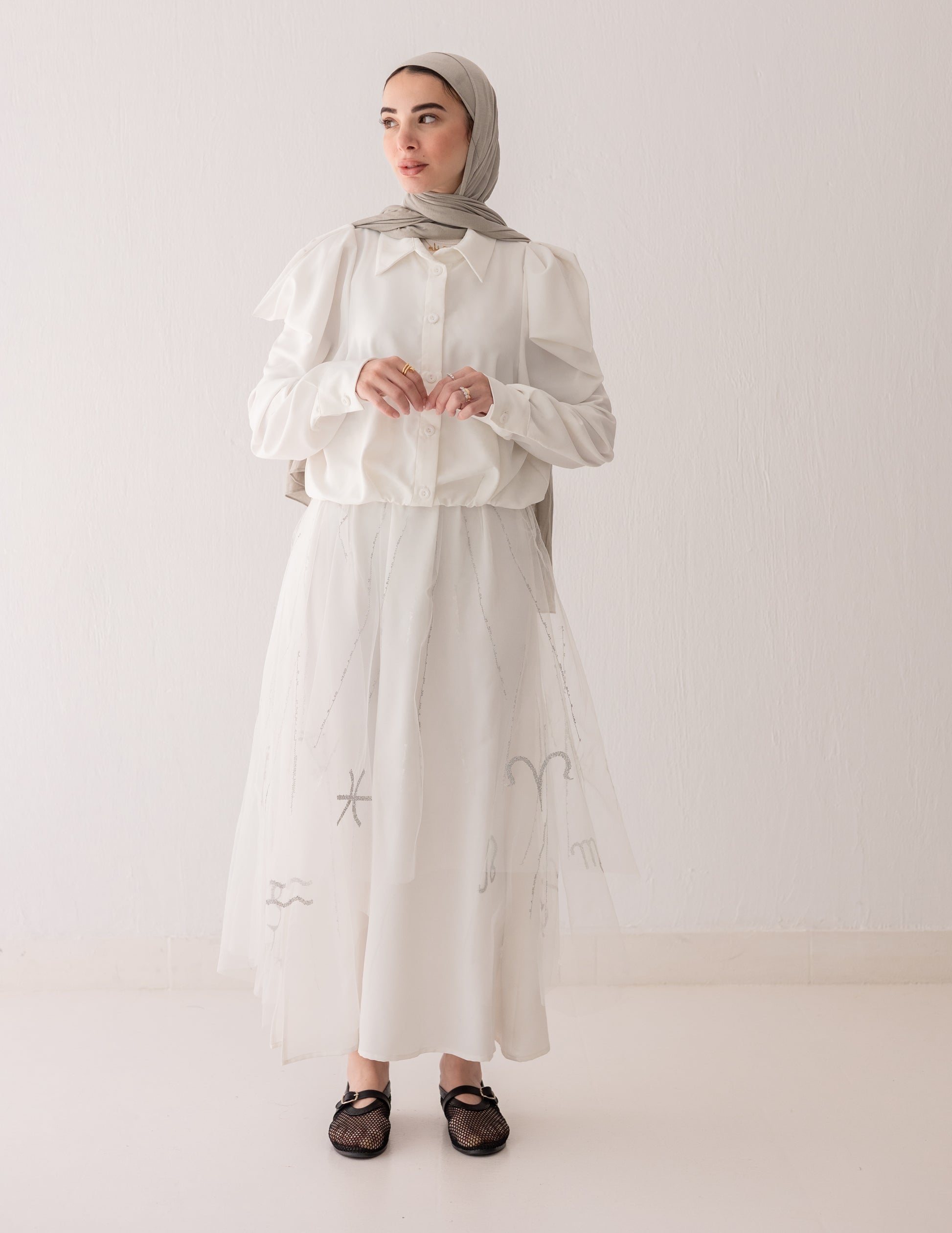 A refined white set defined by delicate tonal embroidery that creates a soft linear texture across the surface. The skirt features a sheer embroidered overlay layered over a smooth base, while the shirt is kept clean and structured for balance. Subtle in tone, yet rich in detail.