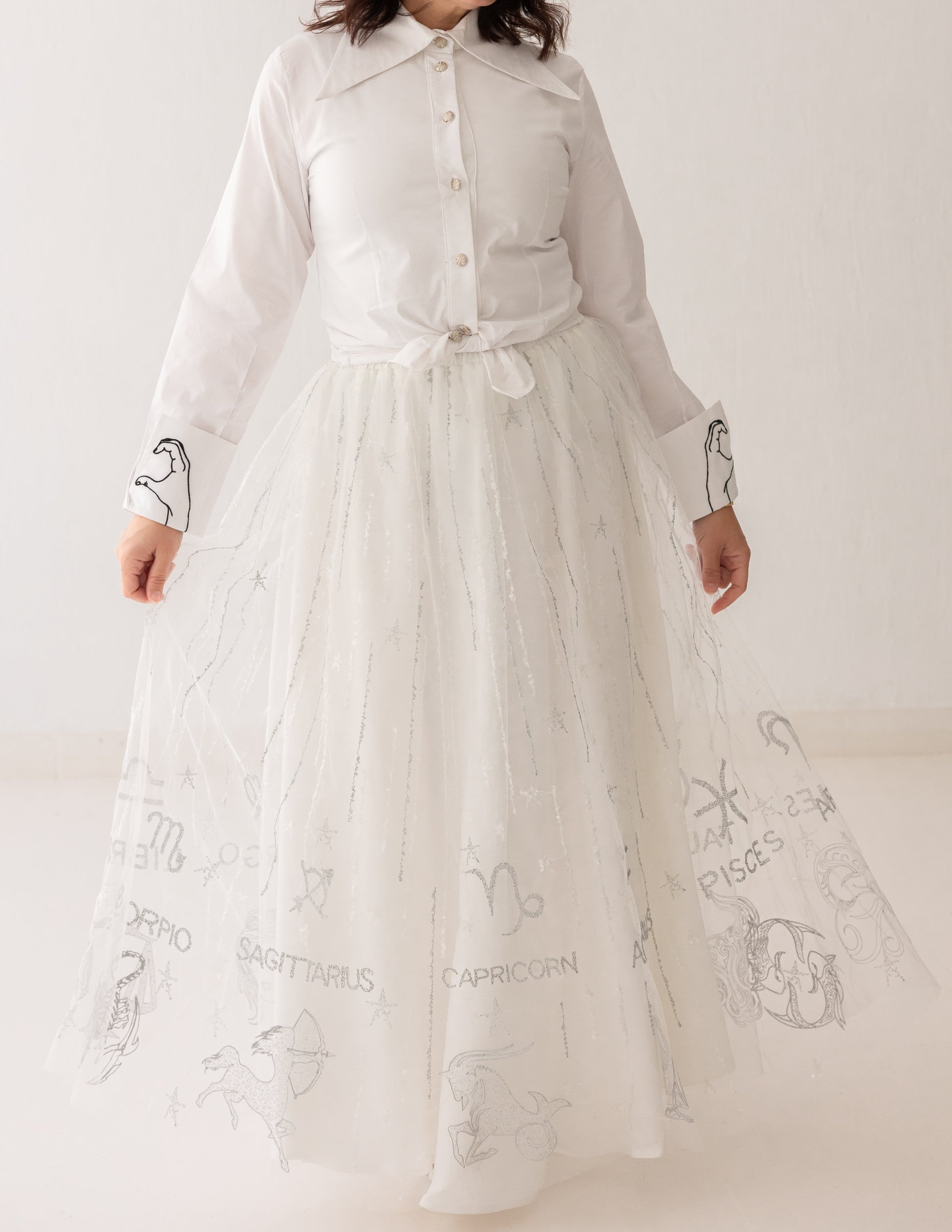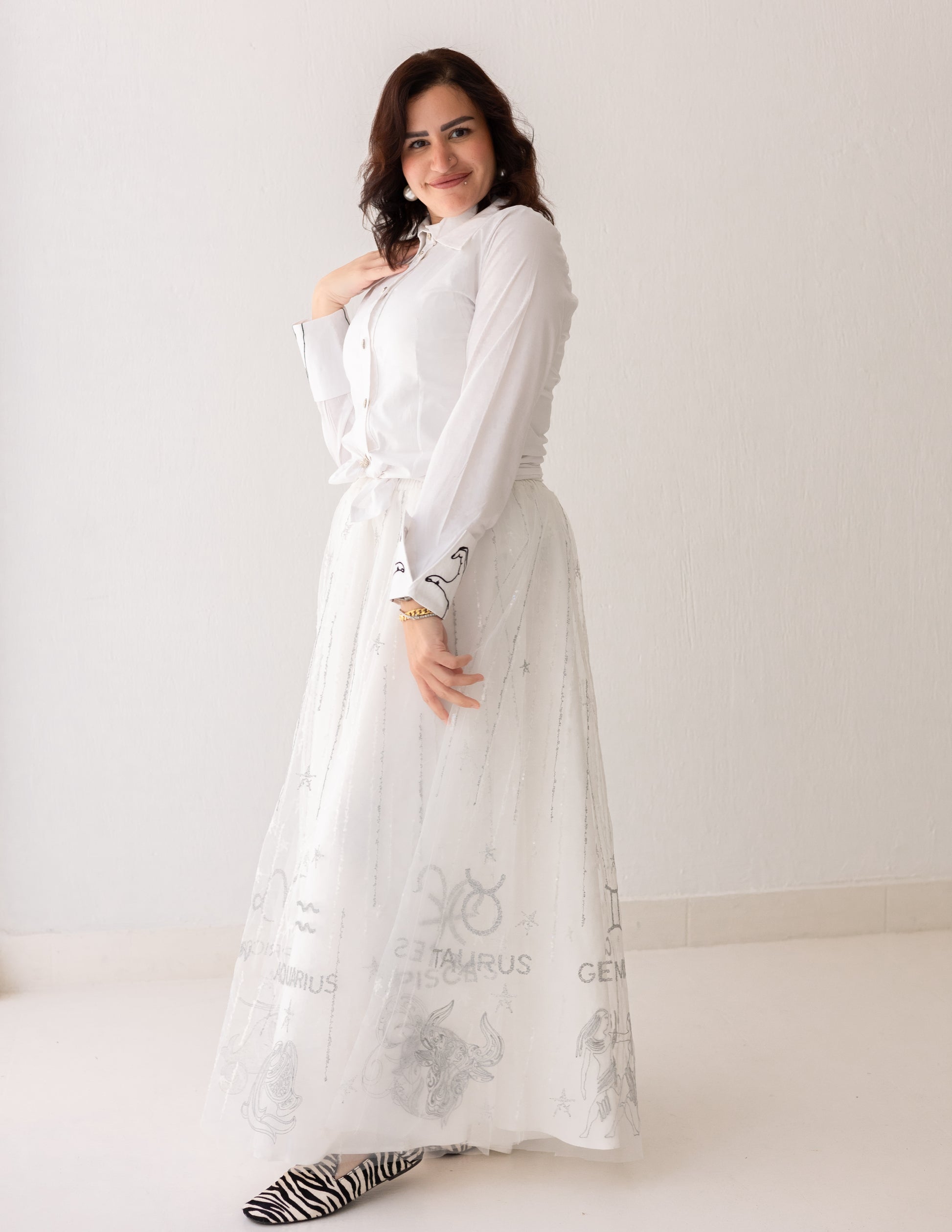 A luminous take on layered elegance. Crafted from Spanish tulle adorned with delicate serma embroidery, the Celeste White Skirt is set over a soft rayon base for fluid movement and comfort. The sheer overlay introduces lightness and dimension, creating a refined silhouette with a subtle statement.