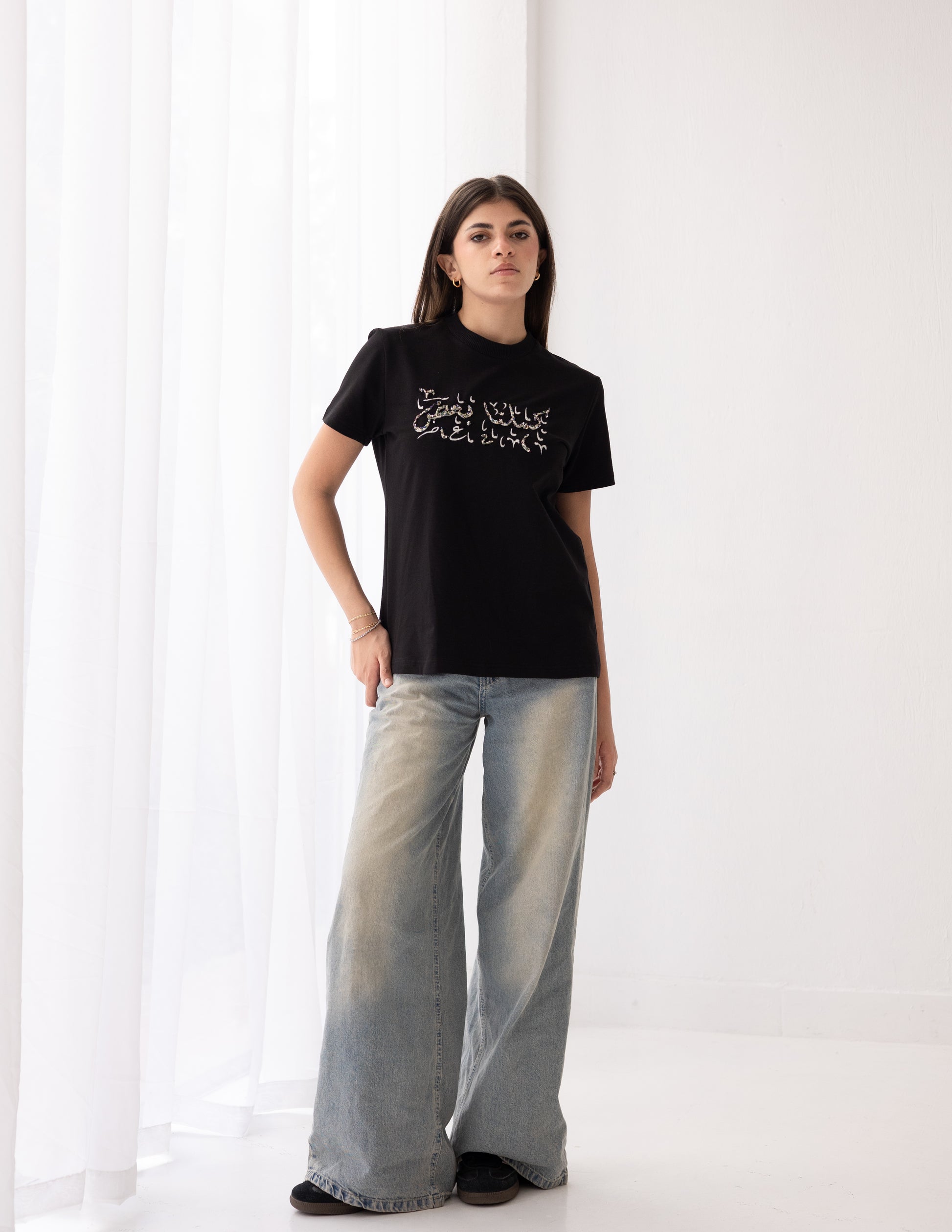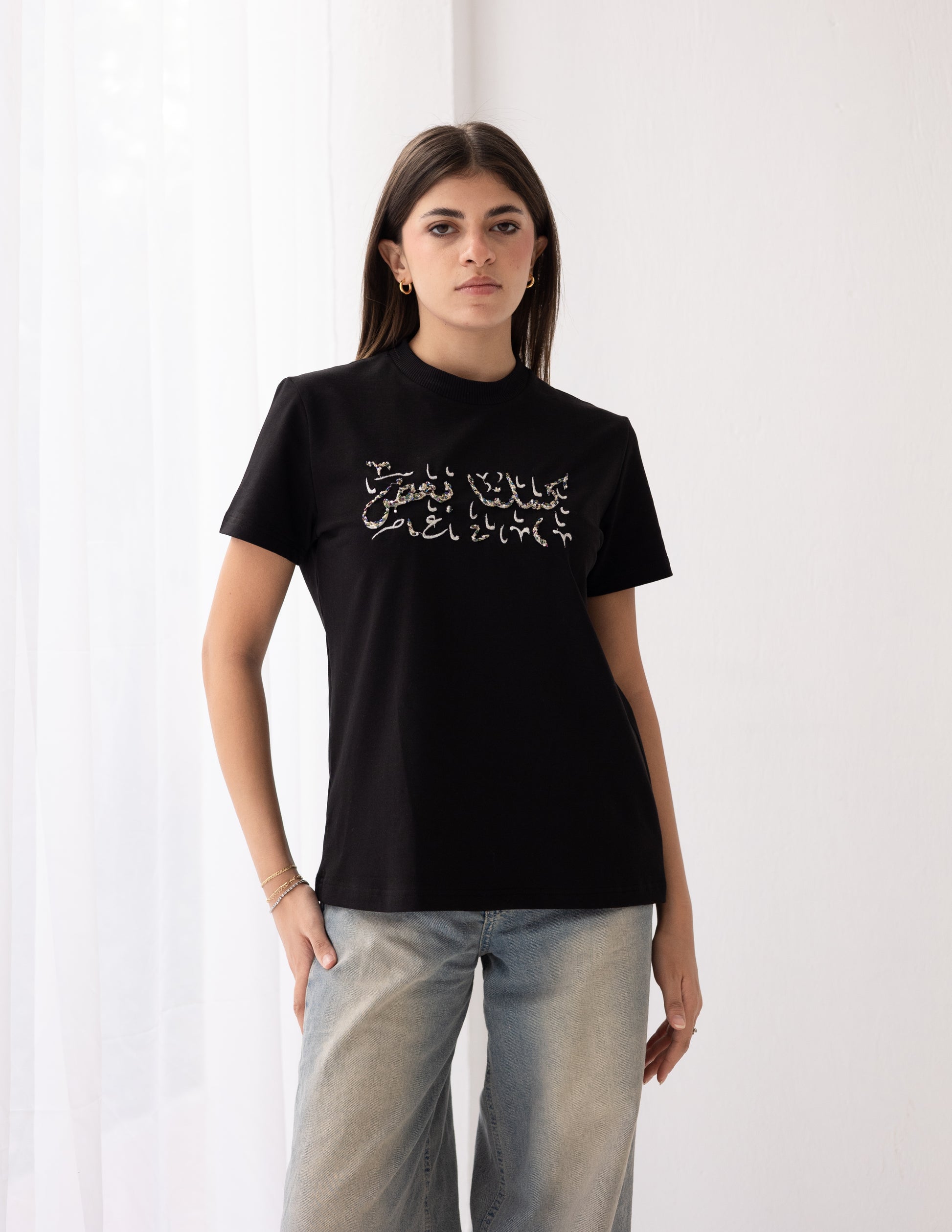 A black half-sleeve cotton tee with a relaxed fit and the phrase “كملنا بعض” — we complete each other — hand-embroidered with care. A timeless piece with a heartfelt message.