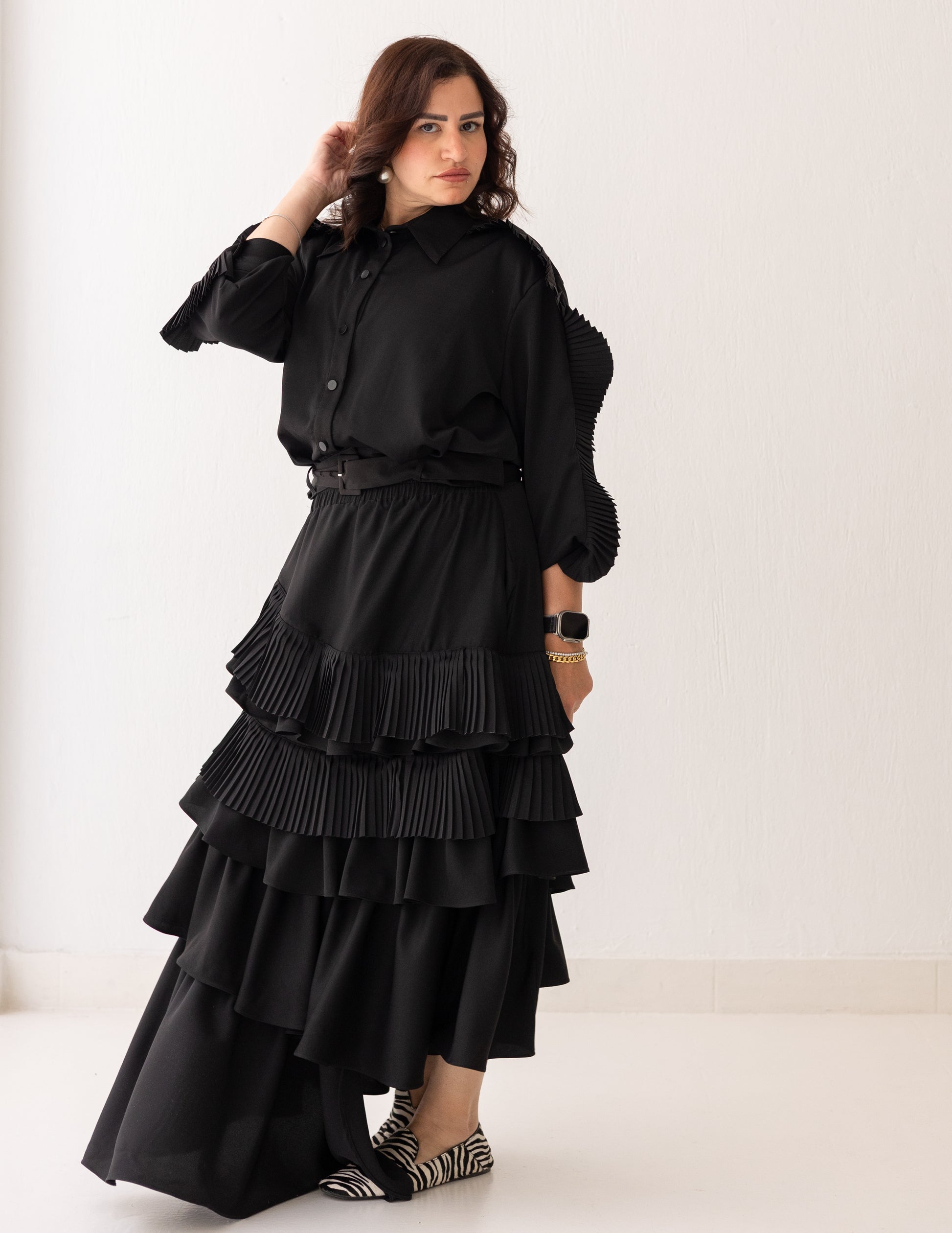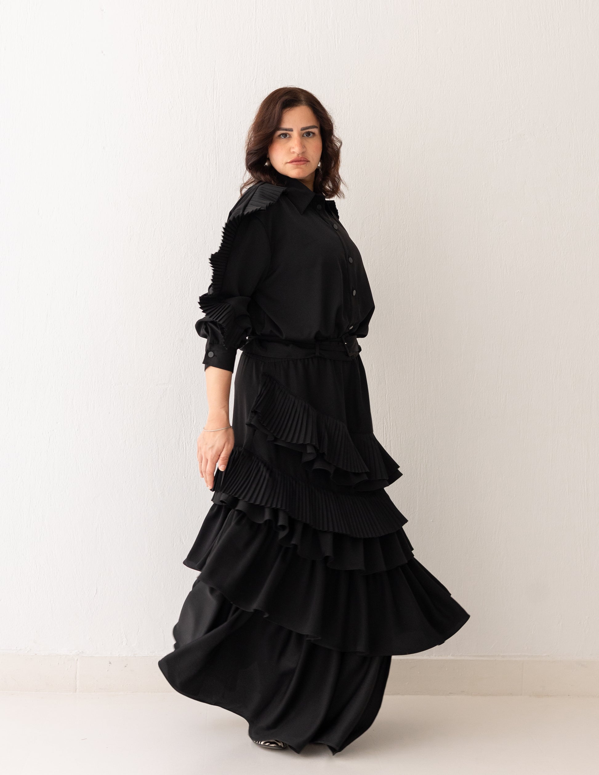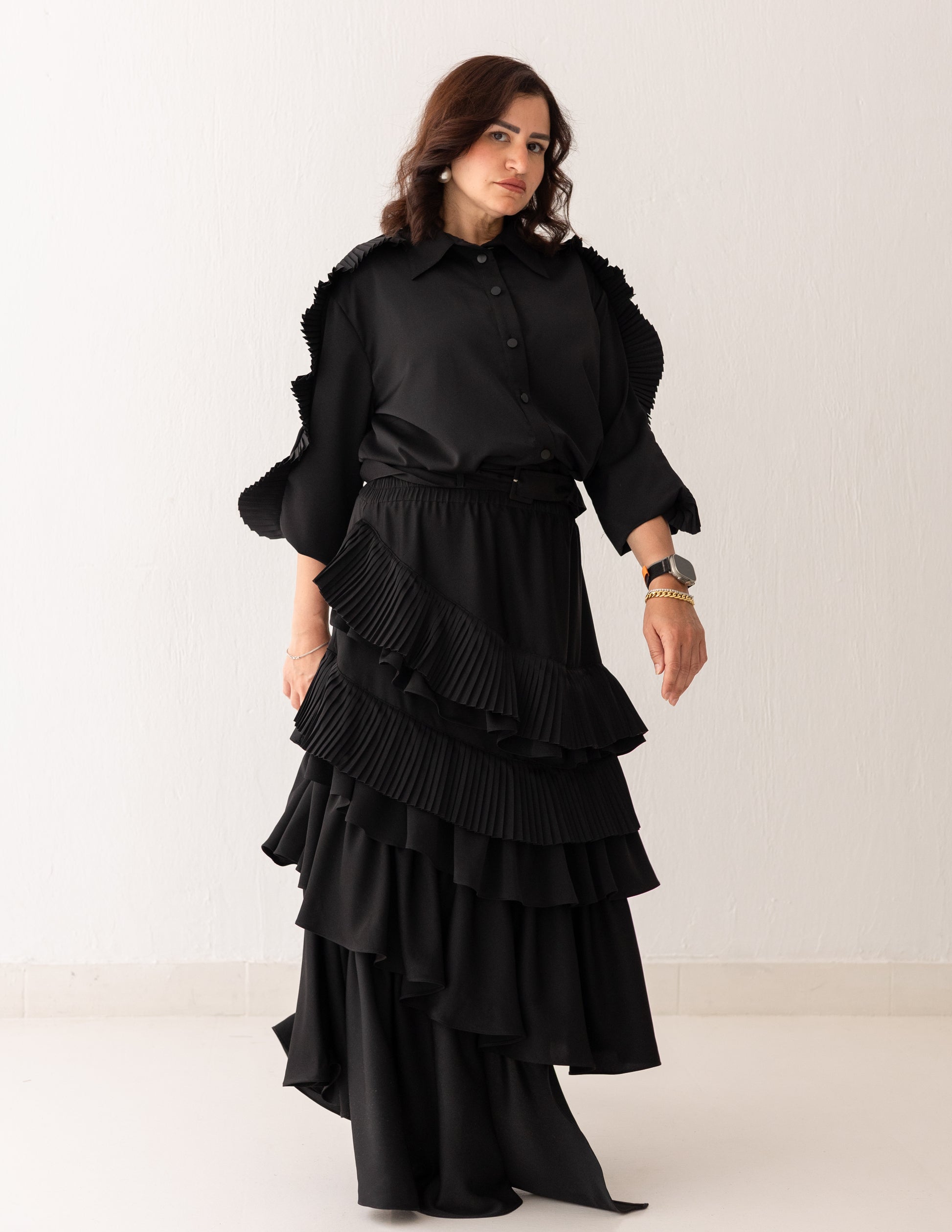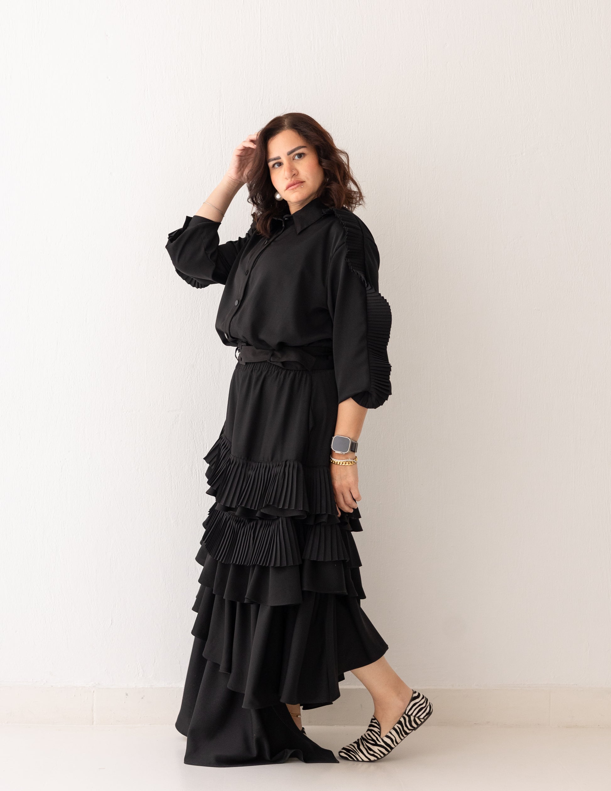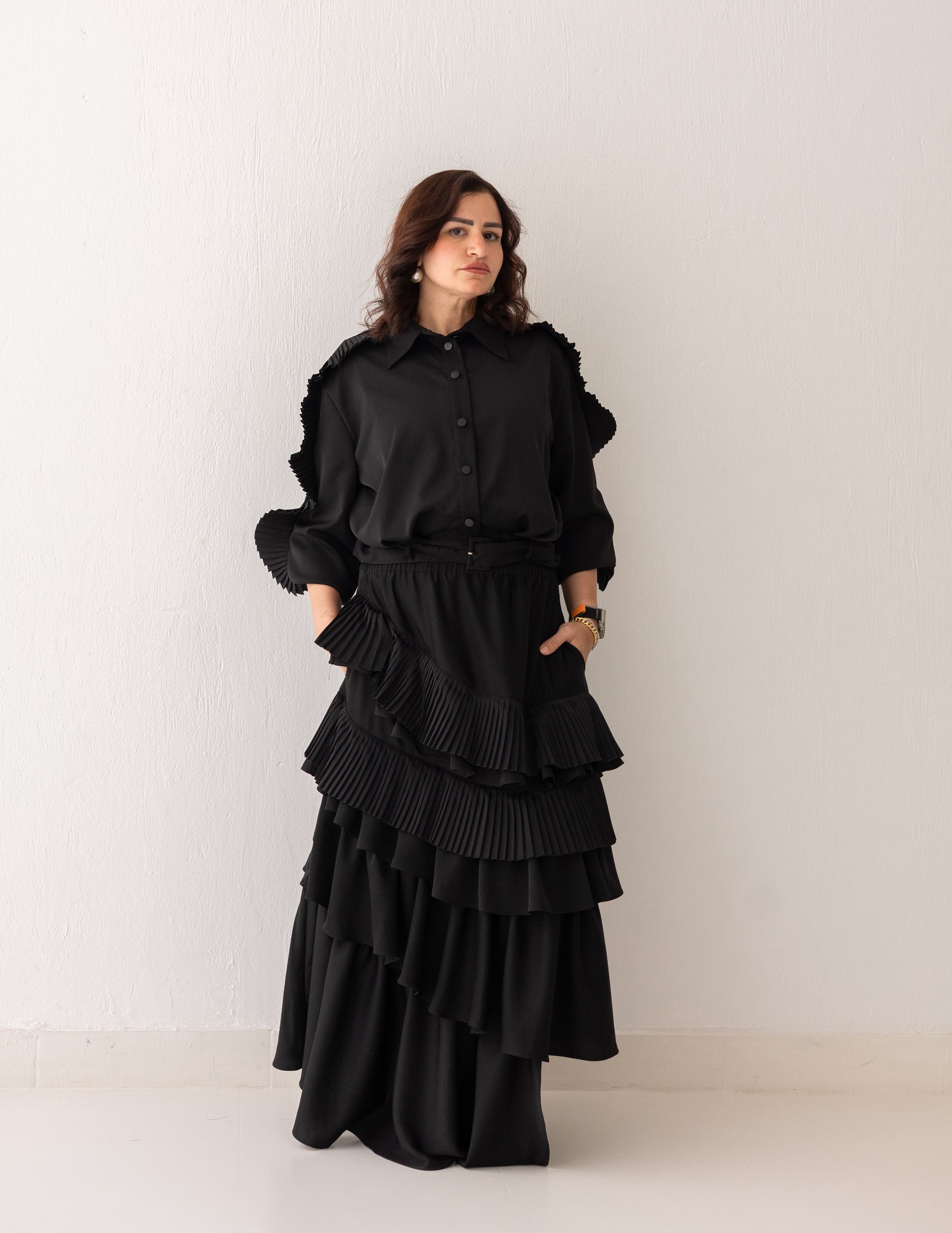 A black set centered around movement and texture. Crafted from cotton silk, it features layered ruffles and fine plissé detailing that create depth and continuous flow. The skirt and shirt move together with volume and fluidity, forming a look that feels bold, elegant, and full of motion.