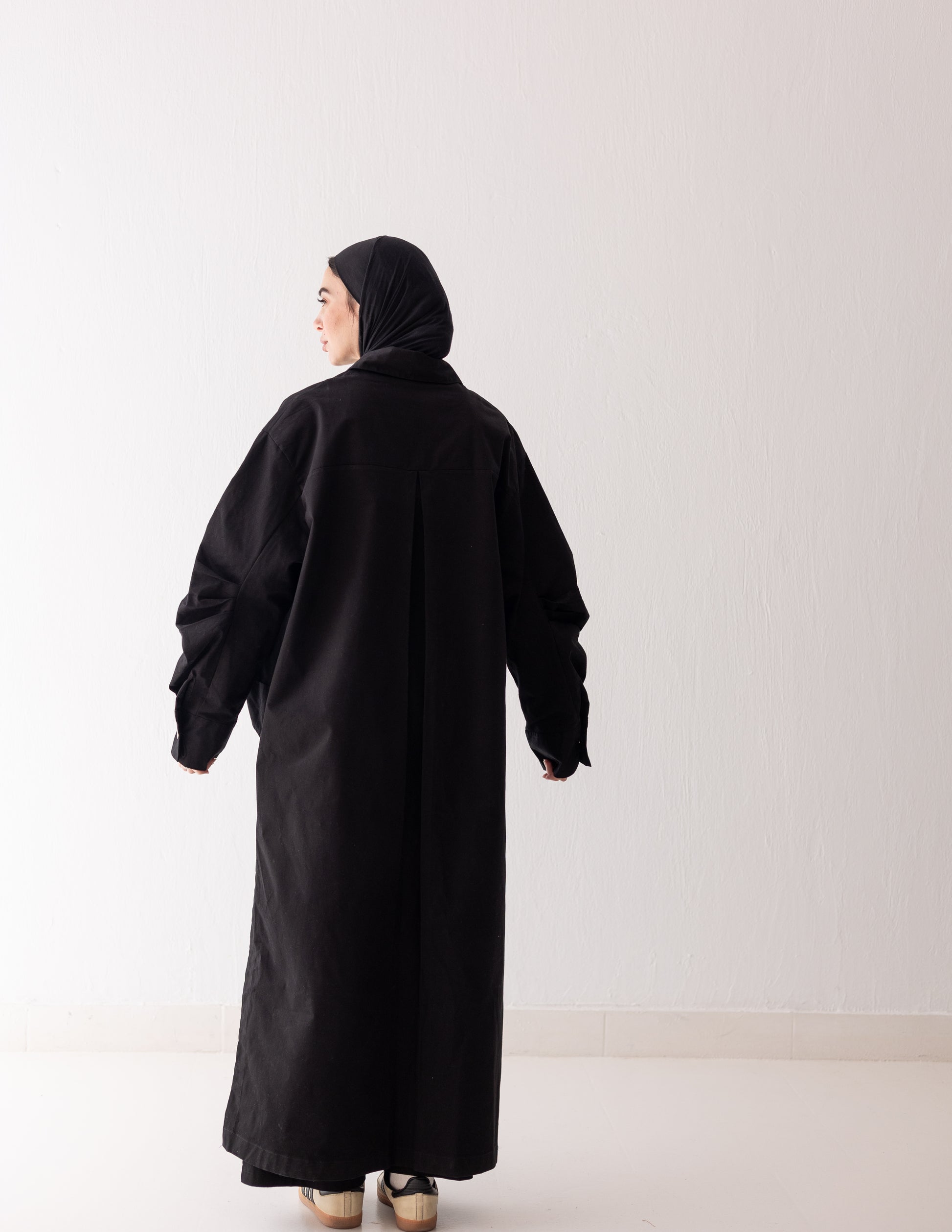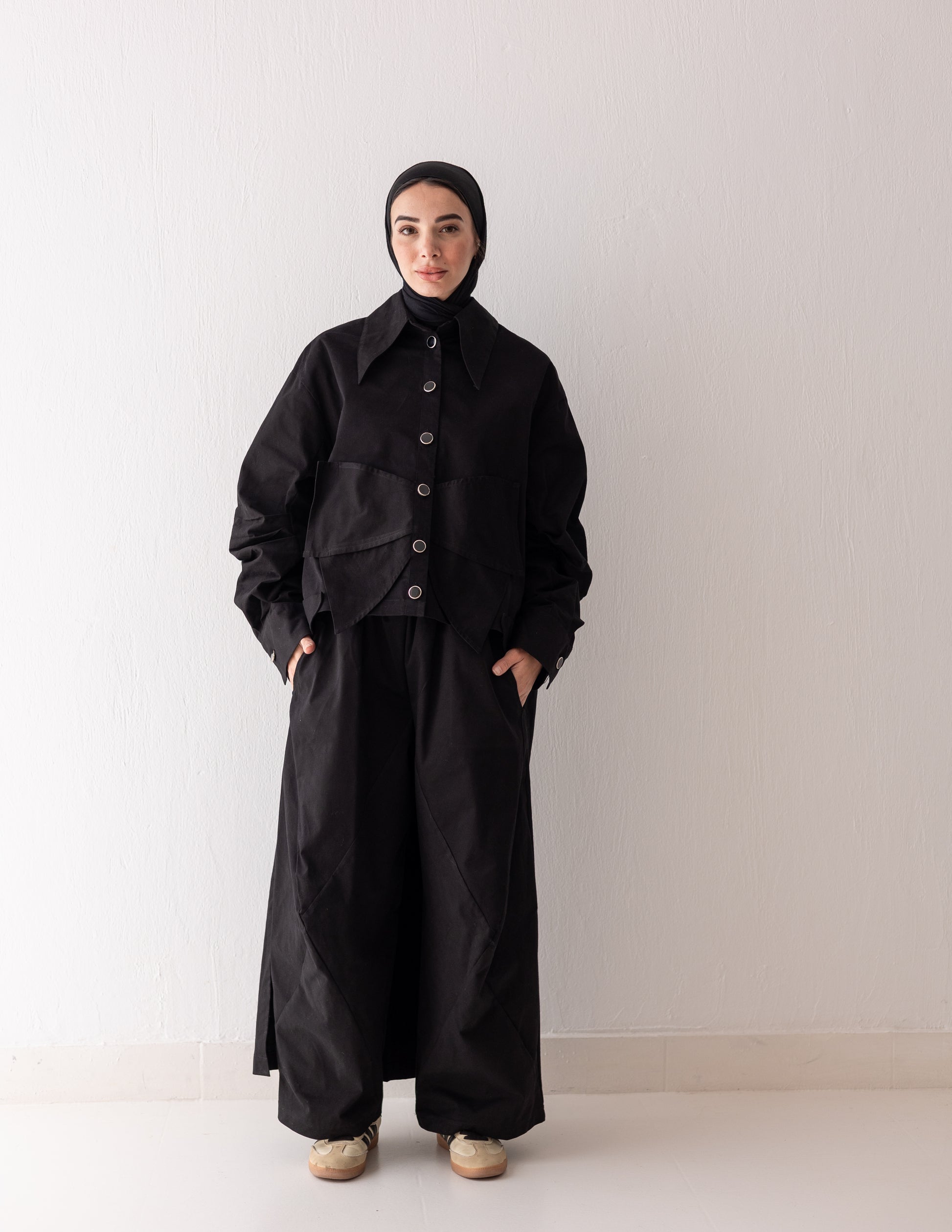 Designed in lightweight summer gabardine, the high-low jacket introduces movement through its asymmetric cut in deep black, paired with relaxed wide-leg pants. A silhouette that shifts with every step, with a strong and effortless presence.