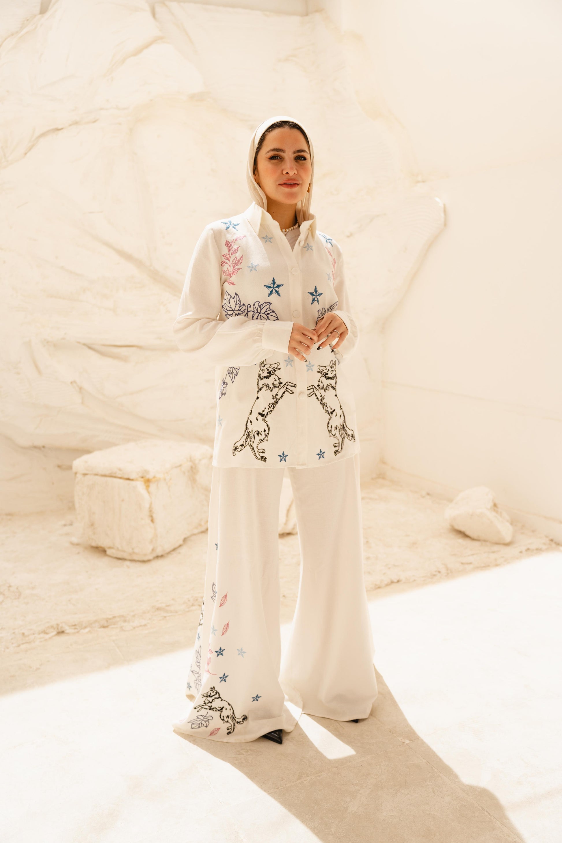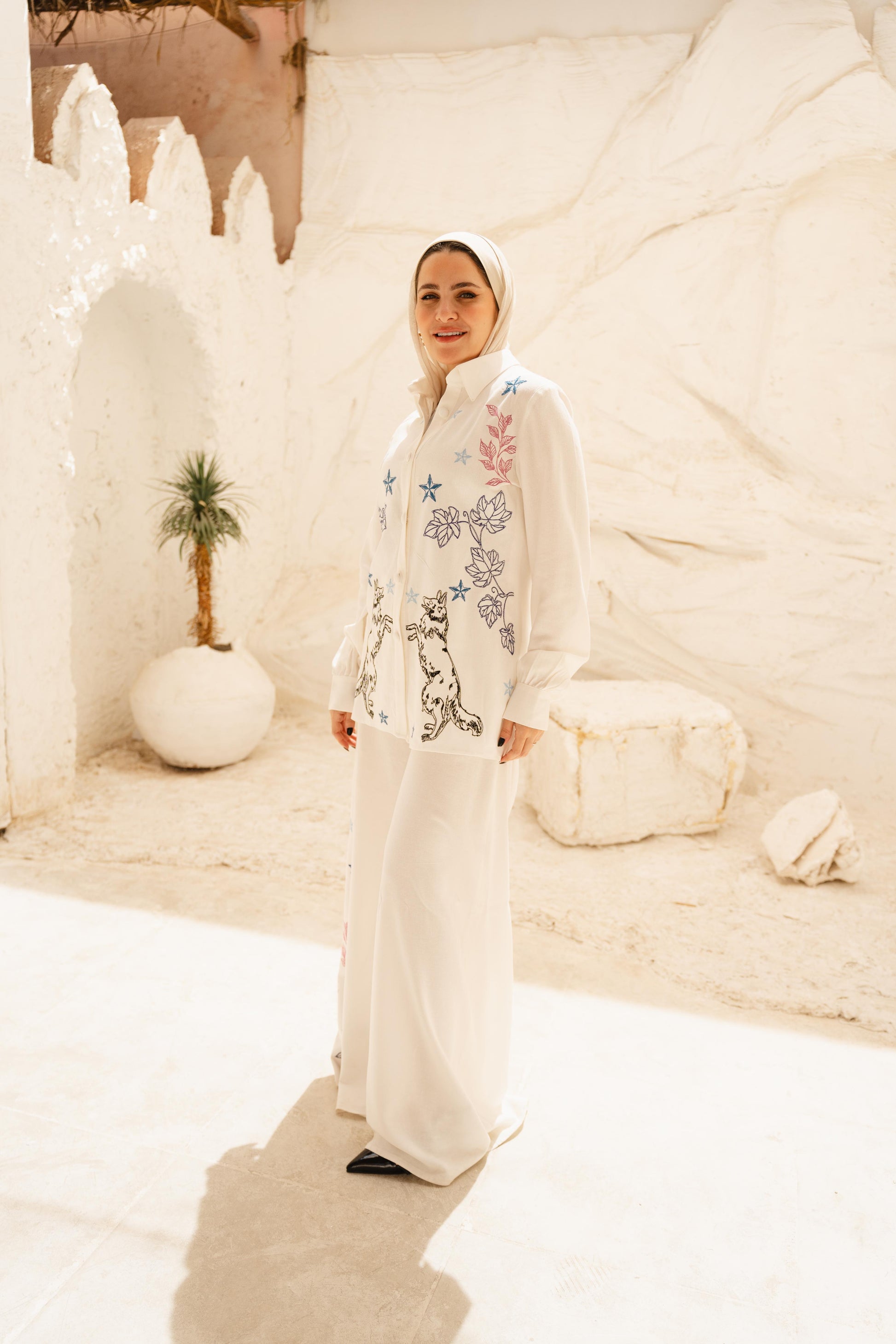 A flowy, comfortable white linen set adorned with intricate, colorful embroidery of leaves and animals, capturing the essence of nature with a unique artistic touch.
