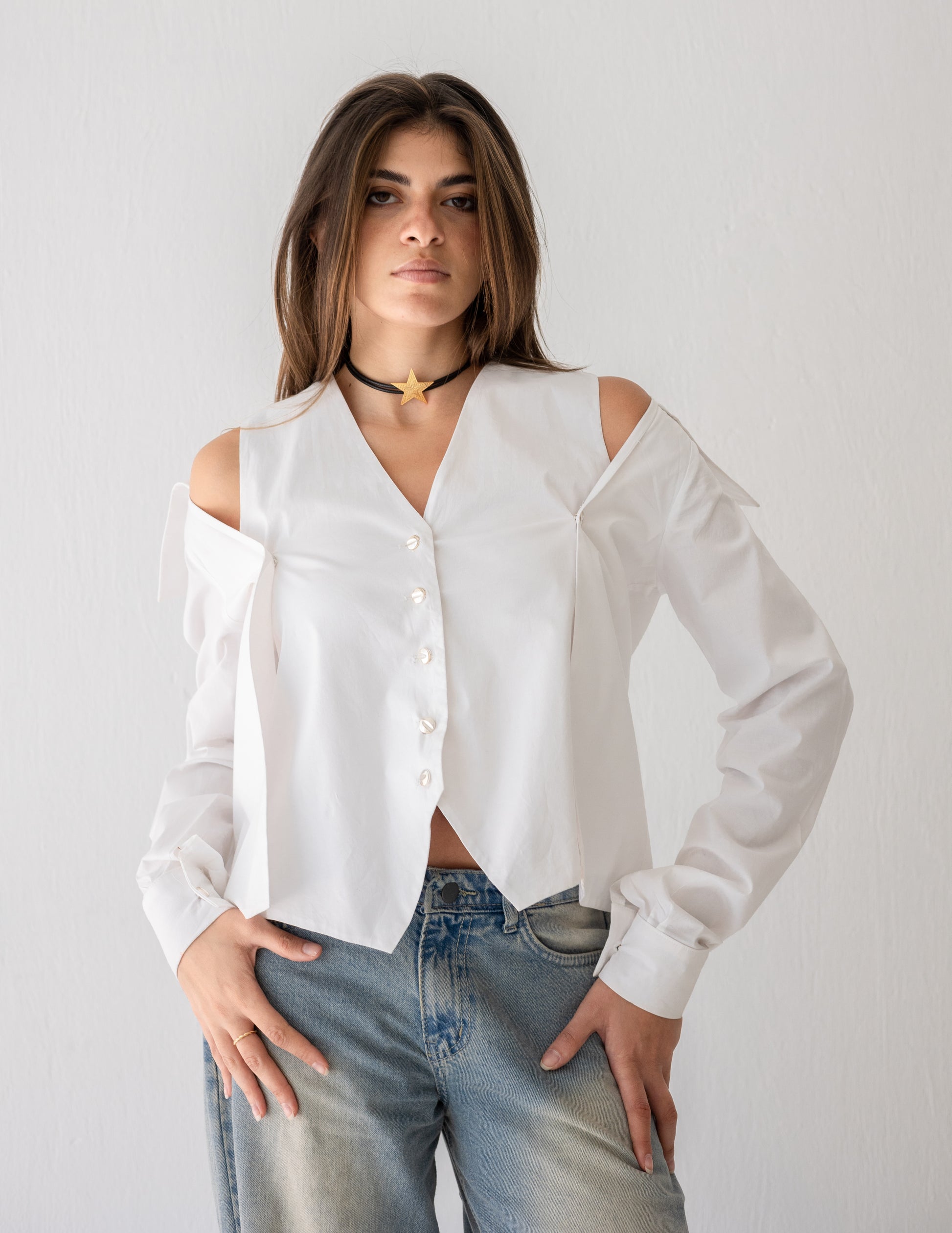 Bold structure meets playful versatility. The Vanta Shirt redefines classic white with sharp cutouts and distinctive design lines that create a fresh, modern silhouette. Made from crisp cotton poplin with a hint of stretch, it’s tailored to offer movement, edge, and individuality.