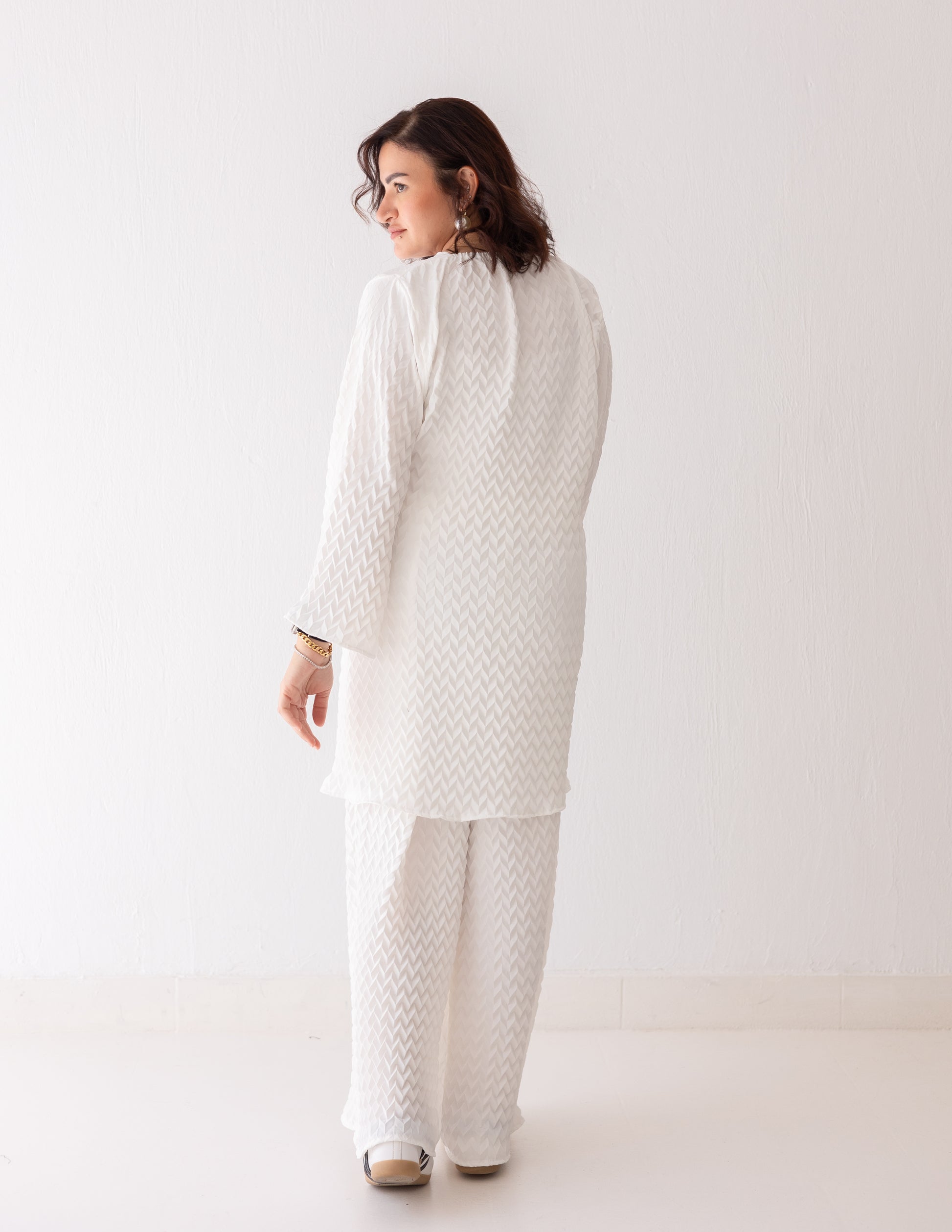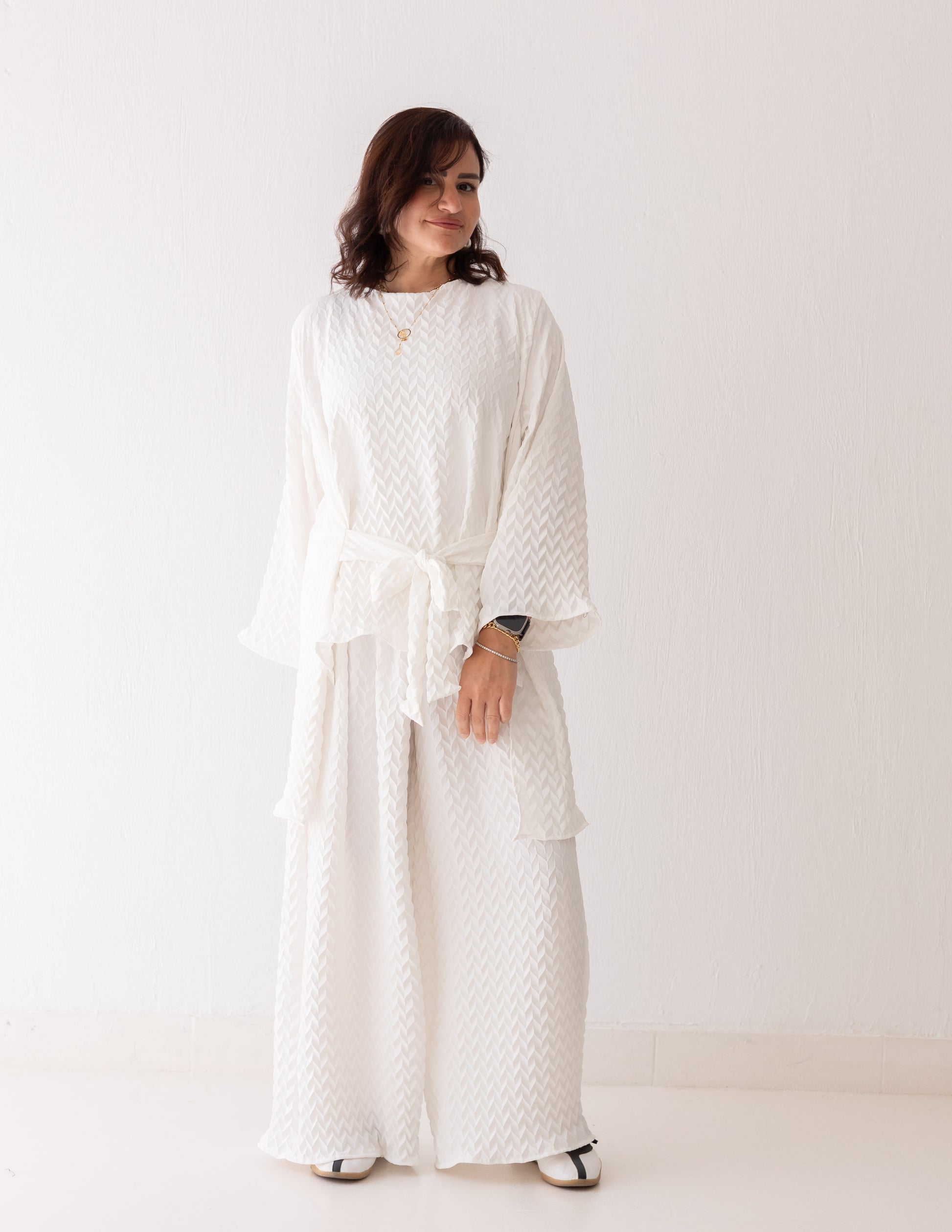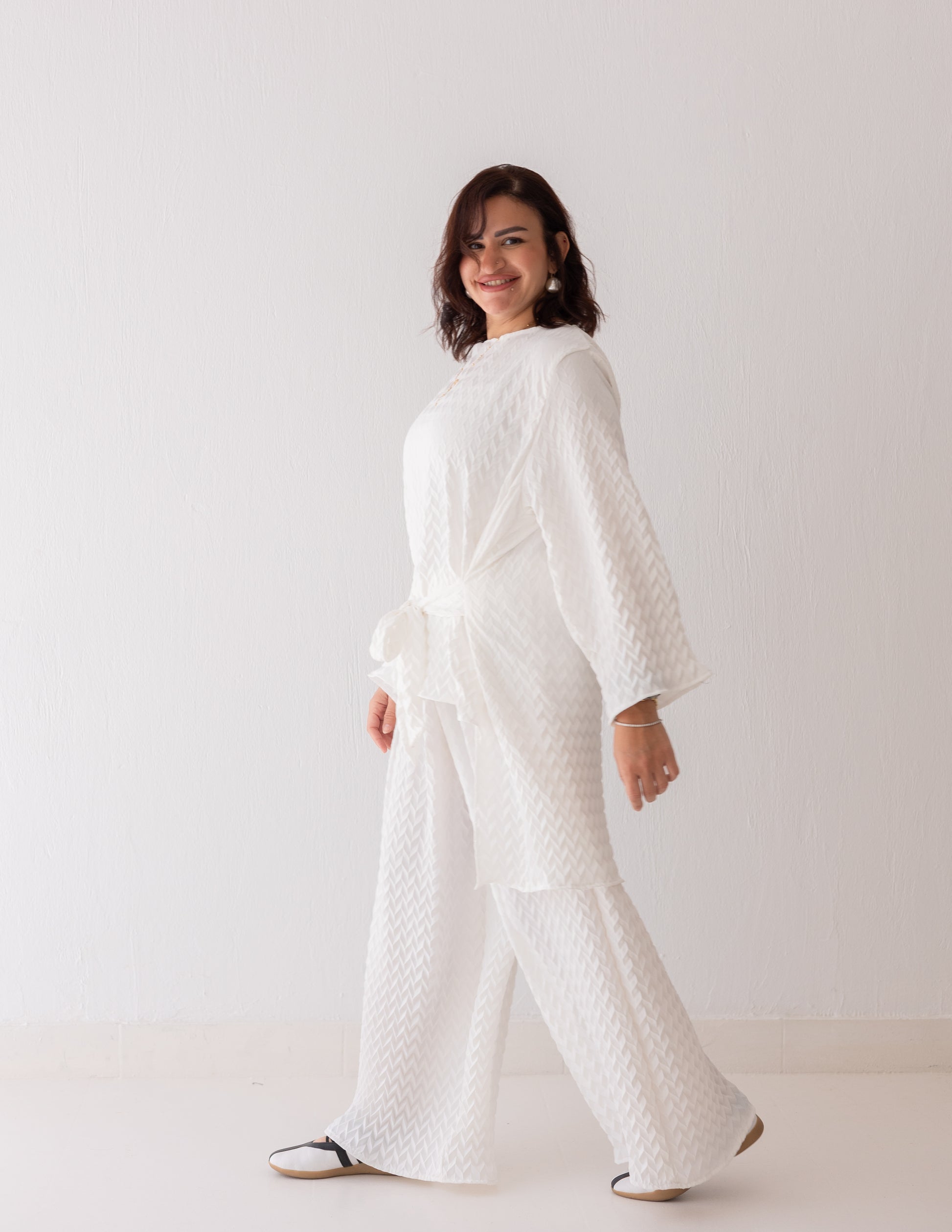 Defined by its tactile surface, this jumpsuit is crafted from cotton silk and finished with fine plissé pleats that create subtle depth and movement. The silhouette remains relaxed yet intentional, with layered detailing that enhances its softness while preserving structure.
